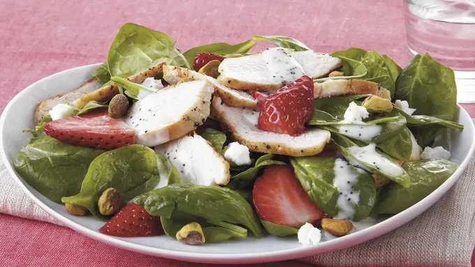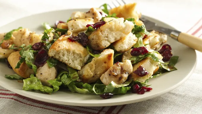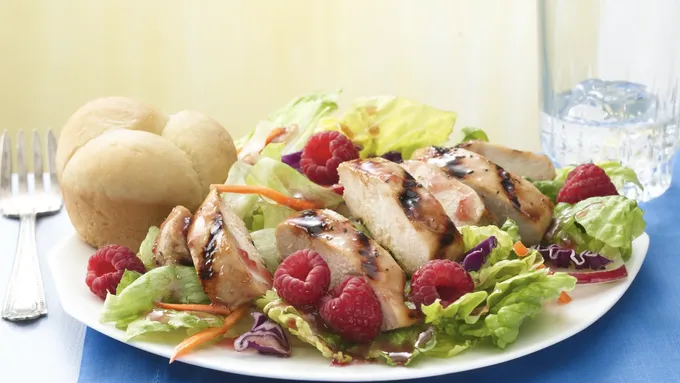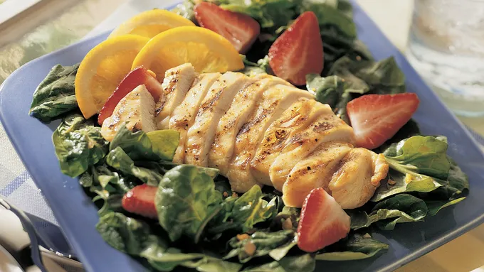 Step5Cut each chicken breast half into slices; arrange on top of salad. Drizzle remaining vinaigrette over salads.