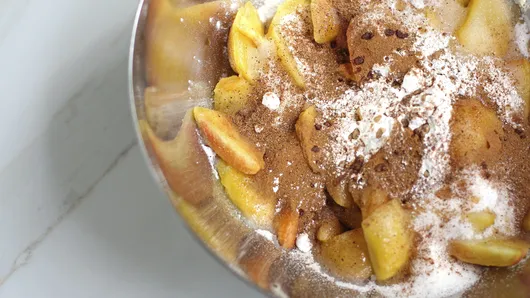 Step2In large bowl, gently stir together peaches, 3/4 cup sugar, the flour, cinnamon, vanilla and table salt. Let stand 10 minutes to allow mixture to thicken.