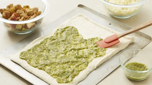 Step5Unroll dough on cookie sheet; press to form 12x8-inch rectangle. Spread 1/2 cup tomatillo salsa over rectangle; sprinkle with cheese. Top with potato mixture; drizzle with remaining 1 tablespoon oil.