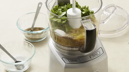 Step4In food processor or blender, place tomatillos, cilantro, 1/2 teaspoon salt and 1/4 teaspoon pepper. Cover; process until smooth.