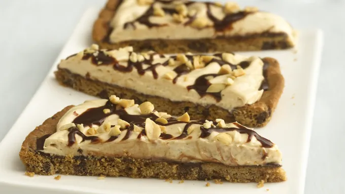 Step4In small microwavable bowl, microwave frosting on High 10 to 15 seconds or until thin and drizzling consistency. Drizzle frosting over cookie pizza. Cut into wedges or squares.