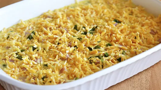 Add in-season veggies to this easy, cheesy egg bake for a crowd-pleasing brunch dish.