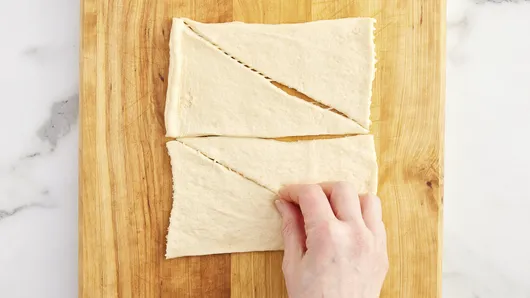 Step1Heat oven to 375°F. Spray 4 regular-size muffin cups with cooking spray. On large cutting board, unroll dough, and separate into two 6x4-inch rectangles. Place one rectangle next to the other to create an 8x6-inch rectangle; pinch together seams.
