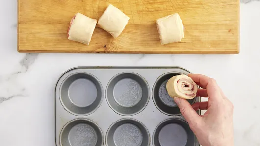 Step3Using sharp knife, cut roll into 4 equal slices; place cut side down in prepared muffin cups. Bake 16 to 20 minutes or until dough is deep golden brown and baked through. Cool 5 minutes in pan; remove from pan with metal spatula.