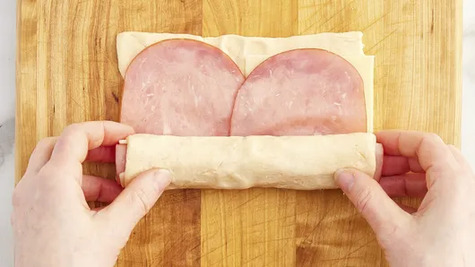 Step2Place cheese slices evenly on top of dough; top with ham. Starting on short, topped edge of rectangle, roll up tightly, and pinch seam together.