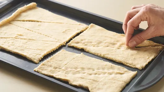 Step2If using crescent rolls: Unroll dough; separate into 4 rectangles. Firmly press perforations to seal. On ungreased cookie sheet, press or roll each to form 7x5-inch rectangle. If using dough sheet: Unroll dough; cut into 4 rectangles. On ungreased cookie sheet, press or roll each to form 7x5 inch rectangle.