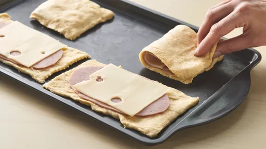Step3Place one ham slice and one cheese slice on each rectangle. For each rectangle, fold dough in half over filling; press edges firmly to seal.