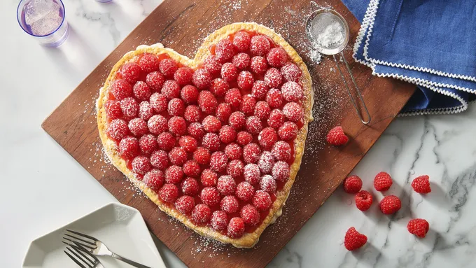 Step2Remove pie crusts from pouches; place flat on cutting board. With sharp knife, cut out 2 (5 1/2-inch) heart shapes from each crust. Drape each pastry heart over inverted custard cup on cookie sheet.