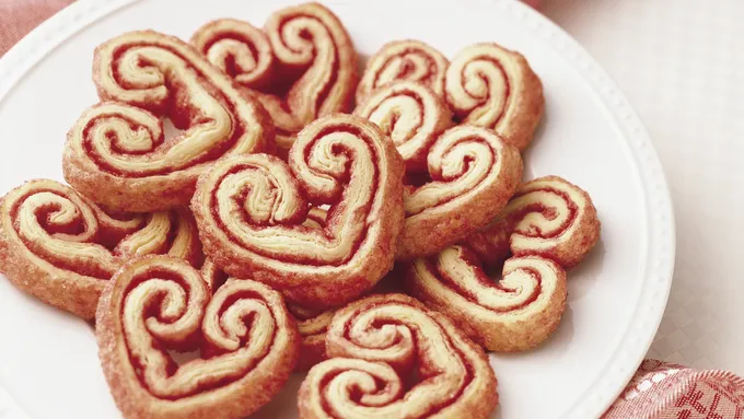 Step4Meanwhile, with 1 1/2-inch or smaller heart-shaped canapé or cookie cutter, cut remaining scraps of dough into 12 small heart shapes; place on ungreased cookie sheet. Sprinkle with sugar. Bake 3 to 5 minutes or until light golden brown. Remove from cookie sheet; cool completely.