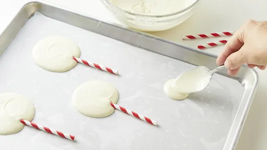 Step3Place 10 straws or sticks on work surface. Drop spoonful of melted chips onto 1 end of each, spreading to approximately 3 inch circle.