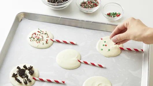 The only thing better than chocolate bark is chocolate bark on a stick! Customize these adorable holiday pops with your favorite sprinkles, candies or even crushed cookies. Bonus: They make great edible gifts.