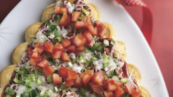 Deck a platter with a holiday tree fashioned from rounds of tender pastry, cheese and veggies. Lovely!