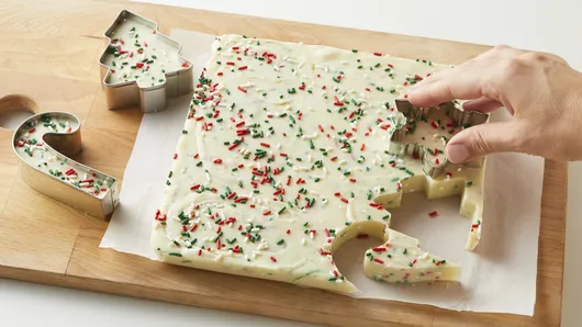 Step4Chill at least 2 hours, or until firm. Remove from pan by lifting edges of parchment paper. Cut into shapes with cookie cutters, or into triangles or squares with sharp knife.