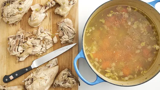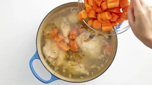 Step2Remove chicken from Dutch oven. Cut meat from bones. Skim off and discard fat from soup. Return meat to soup. Bring to a boil. Reduce heat to low; simmer, uncovered, 10 to 15 minutes or until carrots are almost tender.