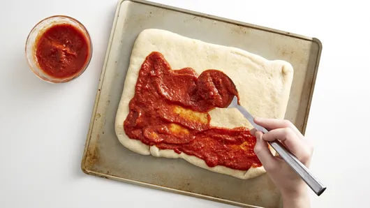 Step3Using a large spoon, ladle pizza sauce over dough. Use the back of the spoon to spread it to a uniform thickness, making sure to spread it almost to the crust edges.
