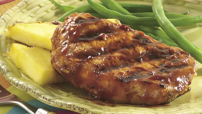 Step3When grill is heated, place pork on gas grill over medium heat or on charcoal grill 4 to 6 inches from medium coals. Cook covered 12 to 15 minutes or until pork is slightly pink when cut near bone, turning twice, and brushing glaze on each side during last 5 minutes of cooking time. Discard any remaining glaze.