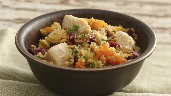 Step2In 3-quart saucepan, heat thawed Meal mix and cooked quinoa just until warm. Divide spinach into individual pasta bowls. Serve chicken mixture over spinach.