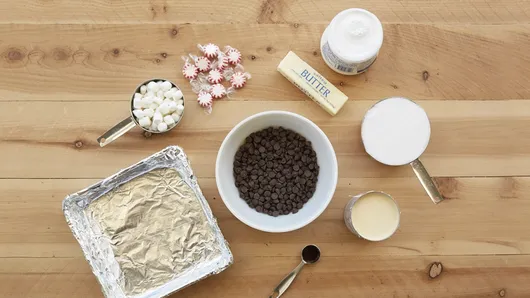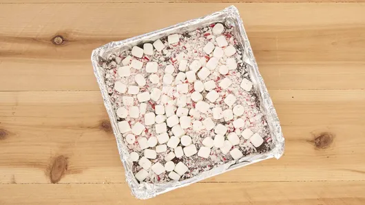 Step3Add baking chips; cook 2 to 3 minutes, stirring until chips are melted and smooth. Remove from heat; stir in marshmallow creme and vanilla until well blended. Pour into pan; spread evenly. Sprinkle with marshmallows and peppermint candies. Refrigerate about 4 hours or until set. Cut into 6 rows by 6 rows.