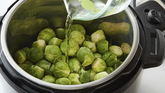Add Brussels sprouts and water to insert of 6-quart Instant Pot®; stir.
