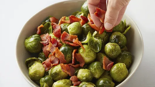 Toss cooked Brussels sprouts with butter, salt and pepper. Top with bacon.