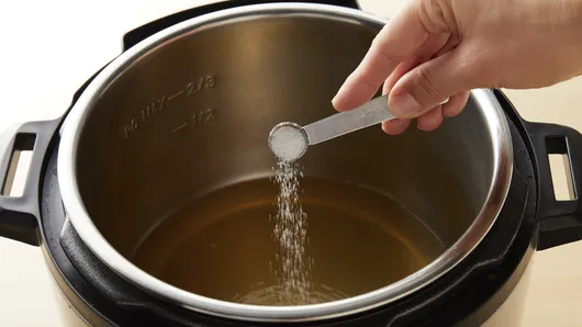 Spray 6-quart Instant Pot® insert with cooking spray. Mix broth and salt in insert.