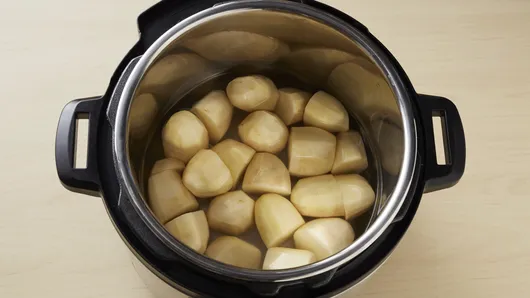 Step1In 6-quart Instant Pot® insert, mix potatoes, water and 1 teaspoon of the salt. Secure lid; set pressure valve to SEALING. Select MANUAL; cook on high pressure 8 minutes. Select CANCEL. Set pressure valve to VENTING to quick-release pressure. Drain off cooking liquid; return potatoes to insert.