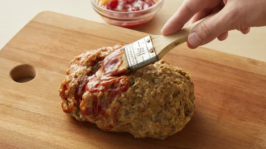 In small bowl, mix ketchup and brown sugar; brush over top of meatloaf. Garnish with parsley. Loosely tent with foil; let stand 10 minutes before serving. Cut into 8 slices to serve.