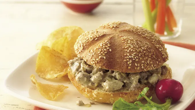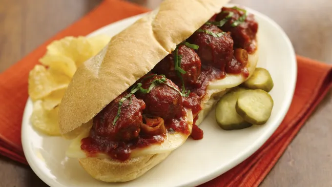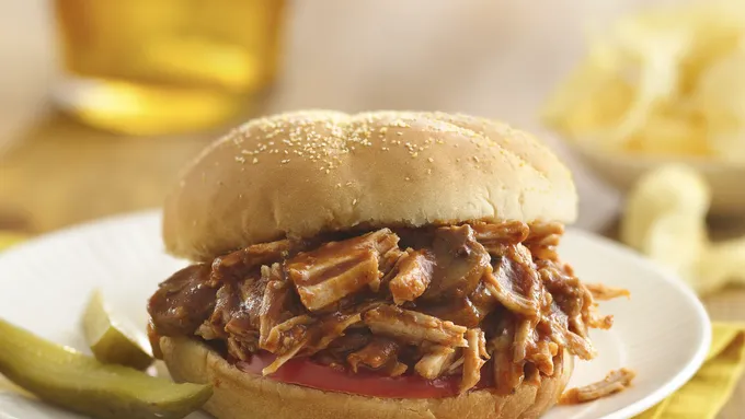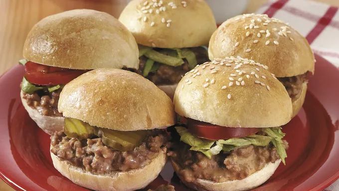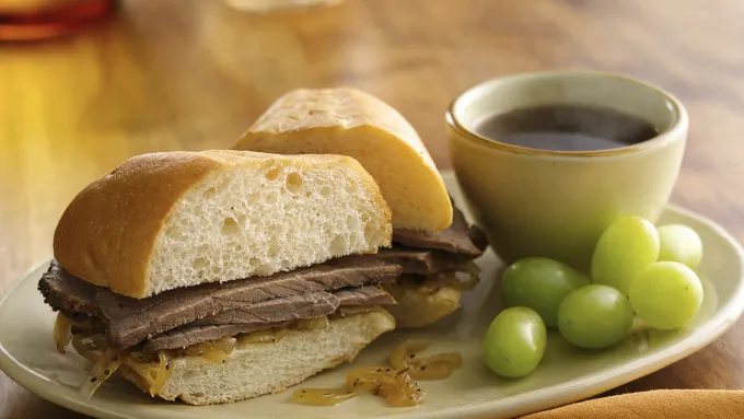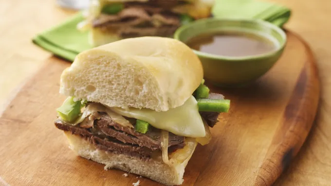 Step5Spoon beef into toasted buns; top with bell pepper rings and cheese. Pour remaining liquid into 8 small custard cups; serve with sandwiches for dipping.