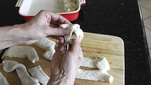 Unroll dough; separate into 12 breadsticks. Twist and tie each breadstick into a “knot-like” ball; place in ungreased 9-inch round cake pan.