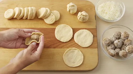 Step3Remove dough from can; do not unroll. Using sharp serrated knife, cut roll evenly into 16 rounds; carefully separate rounds. Press each round to 3 inches in diameter. Place 1 tablespoon cheese and 1 meatball on center of each dough round. Bring up sides of dough over meatball; firmly pinch edges to seal.