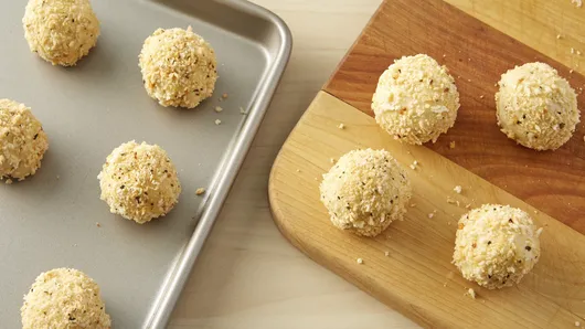 Step4In small shallow bowl, place melted butter. In another shallow bowl, place bread crumbs. Dip dough balls into butter, then roll in bread crumbs. Place seam side down 2 inches apart on ungreased large cookie sheet.