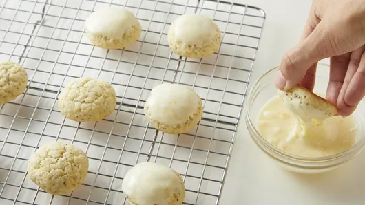In small bowl, stir powdered sugar, 2 tablespoons of the orange juice and remaining 1 teaspoon orange zest; mix well. If necessary, add additional orange juice, 1 teaspoon at a time, until thin enough for glaze. Dip tops of cookies into glaze. Let stand about 20 minutes or until glaze is set. Store in covered airtight container in refrigerator up to 1 week.
