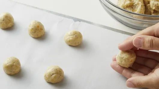 In large bowl, break up cookie dough. Stir or knead in ricotta cheese, flour, poppy seed and 2 teaspoons of the orange zest until well blended. (DO NOT EAT RAW COOKIE DOUGH AFTER COMBINING WITH FLOUR.) Shape dough into 36 (1 1/4-inch) balls. Place 2 inches apart on cookie sheets.