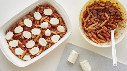 Step3In large bowl, stir together cooked pasta, sausage, mushroom mixture and pasta sauce. Spoon half of mixture into baking dish. Top with half of the mozzarella cheese slices. Spoon remaining pasta mixture over cheese. Top with remaining mozzarella cheese slices.