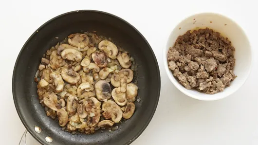 Step2Meanwhile, in 12-inch skillet, cook sausage over medium-high heat 8 minutes, stirring occasionally, until no longer pink. Remove from skillet; set aside. Cook mushrooms and onion in drippings 8 minutes, stirring occasionally, until tender.