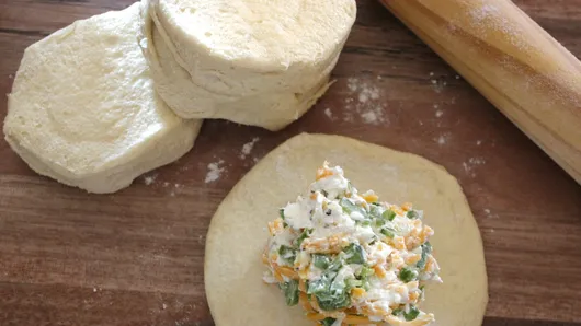 Step2Separate dough into 8 biscuits. With rolling pin, roll out each biscuit into about 1/8-inch-thick round. Spoon about 1 tablespoon cheese filling onto center of each. Bring up dough around filling; pinch to seal tightly. Place seam side down on ungreased cookie sheet.