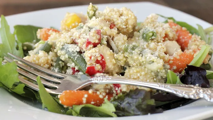 var configuration = {"title":"Jeweled Quinoa and Chicken","introduction":"Looking for a sweet and sour dinner using Progresso® chicken broth? Then try this baked dish that\u0027s made with chicken and quinoa.","servingSize":"1 Serving","image":{"small":{"media":"(min-width: 0px)","src":"https://mojo.generalmills.com/api/public/content/4Knpo7-L5EStcqNUG_0mAQ_webp_base.webp?v=b3555630\u0026t=e724eca7b3c24a8aaa6e089ed9e611fd"},"medium":{"media":"(min-width: 500px)","src":"https://mojo.generalmills.com/api/public/content/4Knpo7-L5EStcqNUG_0mAQ_webp_base.webp?v=b3555630\u0026t=191ddcab8d1c415fa10fa00a14351227"},"large":{"media":"(min-width: 767px)","src":"https://mojo.generalmills.com/api/public/content/4Knpo7-L5EStcqNUG_0mAQ_webp_base.webp?v=b3555630\u0026t=191ddcab8d1c415fa10fa00a14351227"},"alt":"Jeweled Quinoa and Chicken"},"contributor":{"label":"By","name":"Pillsbury Kitchens","profileUrl":"/about-us","displayDate":{"label":"Updated","date":"Feb 27, 2014"}},"ingredientGroups":[{"ingredients":[{"quantity":"1","description":"cup uncooked quinoa "},{"quantity":"2","description":"cups water"},{"quantity":"2","description":"tablespoons olive oil"},{"quantity":"1","description":"lb boneless skinless chicken breasts, cut into 1-inch pieces"},{"quantity":"1/2","description":"teaspoon salt"},{"quantity":"1/4","description":"teaspoon pepper"},{"quantity":"4","description":"large shallots, sliced (about 1 cup)"},{"quantity":"1/2","description":"cup Progresso™ chicken broth (from 32-oz carton)"},{"quantity":"3/4","description":"cup apricot preserves"},{"quantity":"1/3","description":"cup sweetened dried cranberries"},{"quantity":"1/3","description":"cup golden raisins"},{"quantity":"4","description":"tablespoons chopped fresh parsley"},{"quantity":"1/4","description":"cup pine nuts"}]}],"steps":[{"description":"Heat oven to 350°F. Spray 2-quart round casserole with cooking spray."},{"description":"In 2-quart saucepan, heat quinoa and water to boiling over high heat. Reduce heat to low. Cover; simmer 10 to 15 minutes or until all water is absorbed."},{"description":"Meanwhile, in 12-inch nonstick skillet, heat 1 tablespoon of the oil over medium-high heat. Cook chicken, salt and pepper in oil 6 to 8 minutes, stirring occasionally, until chicken is no longer pink in center. Remove with slotted spoon to bowl. Reduce heat to medium. Cook shallots in remaining 1 tablespoon oil 3 minutes, stirring occasionally, until tender. Stir in broth and preserves. Heat to boiling; remove from heat. Return chicken to skillet, discarding any juices in bowl."},{"description":"In casserole, mix cooked quinoa, chicken mixture, cranberries, raisins and 3 tablespoons of the parsley. Sprinkle with remaining 1 tablespoon parsley and the pine nuts."},{"description":"Bake uncovered 15 minutes or until thoroughly heated and nuts are toasted."}],"tips":[{"title":"","description":"You can change up this recipe by substituting other favorite grains, such as rice or couscous, for the quinoa.","category":"Substitution","tipShots":[]},{"title":"Tips","description":"Quinoa, a grain native to South American cuisine, is pronounced KEEN-wah. It contains more protein than any other grain and has a delicate, bland flavor that takes on the flavors of ingredients it’s paired with.","category":"Recipe/Ingredient Facts","tipShots":[]},{"title":"","description":"Recipe meets Kitchen Tested criteria. Reviewed as part of SEO improvements Oct. 2019.","category":"Kitchen Tested","tipShots":[]}],"kitchenTips":[{"title":"","description":"You can change up this recipe by substituting other favorite grains, such as rice or couscous, for the quinoa.","category":"Substitution","tipShots":[]},{"title":"Tips","description":"Quinoa, a grain native to South American cuisine, is pronounced KEEN-wah. It contains more protein than any other grain and has a delicate, bland flavor that takes on the flavors of ingredients it’s paired with.","category":"Recipe/Ingredient Facts","tipShots":[]}],"additionalContent":[],"faq":[],"tipCategories":[{"categoryName":"Kitchen Tested","heading":"More About This Recipe","cssClass":"recipePartStory","expandOnInit":false,"expandText":"More +","collapseText":"Less -","expandEventName":"","collapseEventName":"","image":"","tips":[{"title":"","description":"Recipe meets Kitchen Tested criteria. Reviewed as part of SEO improvements Oct. 2019.","category":"Kitchen Tested","tipShots":[]}],"isExpandable":false}],"nutritionInfo":{"configuration":{"showAsTable":false,"noNutritionInformationAvailableMessage":"No nutrition information available for this recipe","poweredByText":"\u003cp\u003eNutrition information for this recipe is estimated using a leading nutrition calculation application, but is an estimate only. Actual nutrition values will vary based on the exact ingredients or brands you may use.\u003c/p\u003e\n\u003ca href=\u0022http://developer.edamam.com\u0022\u003ePowered By \u003cimg src=\u0022-/media/C4F33FD467AB4A3AB59AAC4F6306AB04.ashx\u0022 alt=\u0022Edamam\u0022 /\u003e\u003c/a\u003e","nutritionChartTitle":"Nutrition Facts","nutritionInformationLabel":"Nutrition","servingSizeText":"Serving Size:","dailyValuesDisclaimer":"*Percent Daily Values are based on a 2,000 calorie diet.","percentDailyValueText":"% Daily Value","percentDailyValueFooterTitleText":"% Daily Value*:","exchangeInformationTitleText":"Exchanges:","nutritionFactsExpandText":"More Nutrition","nutritionFactsCollapseText":"Less Nutrition"},"facts":{"carbohydrateChoice":{"amountPercent":"","amountUnits":"7 1/2","title":"Carbohydrate Choice"},"vitaminA":{"amountPercent":"45%","amountUnits":"45%","title":"Vitamin A"},"vitaminC":{"amountPercent":"20%","amountUnits":"20%","title":"Vitamin C"},"calcium":{"amountPercent":"10%","amountUnits":"10%","title":"Calcium"},"iron":{"amountPercent":"35%","amountUnits":"35%","title":"Iron"},"protein":{"amountPercent":"","amountUnits":"37g","title":"Protein"},"dietaryFiber":{"amountPercent":"32%","amountUnits":"8g","title"