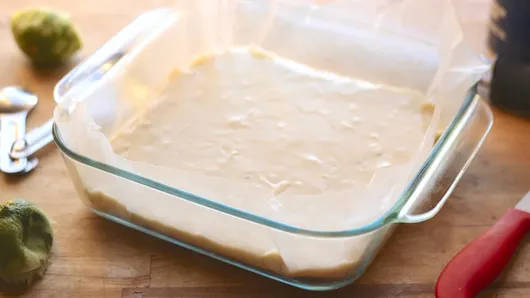 Step1Line 8-inch square (2-quart) glass baking dish with waxed paper or cooking parchment paper.