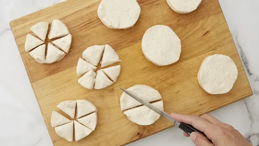 Meanwhile, separate dough into 8 biscuits. Cut each biscuit into 6 pieces.
