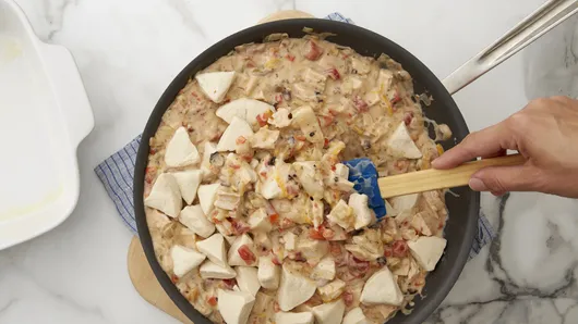 Gently fold biscuit pieces into turkey mixture in skillet; pour hot mixture into baking dish.
