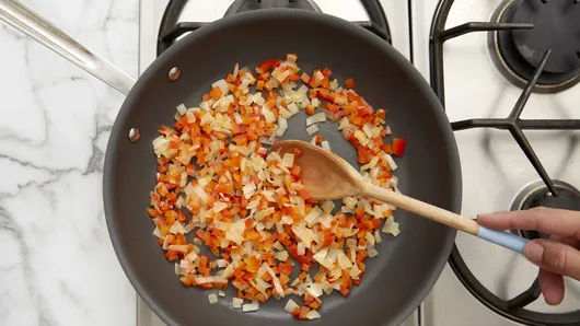 Heat oven to 350°F. Spray 13x9-inch (3-quart) baking dish with cooking spray. In 12-inch nonstick skillet, heat oil over medium-high heat. Add onions and bell pepper; cook 4 to 7 minutes, stirring occasionally, until tender and starting to brown.