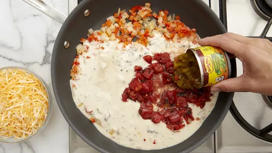 Stir soup, tomatoes and chiles into onion mixture in skillet; stir in turkey, and heat to simmering. Reduce heat to medium; cook 1 to 2 minutes or until mixture is heated through. Remove from heat; carefully stir in 1 cup of the cheese.