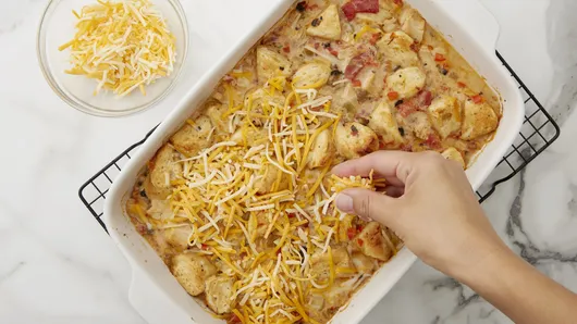 var configuration = {"title":"King Ranch Turkey Bubble-Up Bake","introduction":"Transform leftover turkey into a kingly casserole with this savory, cheesy biscuit bubble-up bake. It\u0027s the perfect family lunch or dinner! It also makes a great addition to a potluck—because we all know casseroles are the ultimate shareable dish.","servingSize":"1 Serving","image":{"small":{"media":"(min-width: 0px)","src":"https://mojo.generalmills.com/api/public/content/lEuaPApfpkKBaeo1tpMNlg_webp_base.webp?v=53644127\u0026t=e724eca7b3c24a8aaa6e089ed9e611fd"},"medium":{"media":"(min-width: 500px)","src":"https://mojo.generalmills.com/api/public/content/lEuaPApfpkKBaeo1tpMNlg_webp_base.webp?v=53644127\u0026t=191ddcab8d1c415fa10fa00a14351227"},"large":{"media":"(min-width: 767px)","src":"https://mojo.generalmills.com/api/public/content/lEuaPApfpkKBaeo1tpMNlg_webp_base.webp?v=53644127\u0026t=191ddcab8d1c415fa10fa00a14351227"},"alt":"King Ranch Turkey Bubble-Up Bake"},"contributor":{"label":"By","name":"Pillsbury Kitchens","profileUrl":"/about-us","displayDate":{"label":"Updated","date":"Nov 7, 2022"}},"ingredientGroups":[{"ingredients":[{"quantity":"1","description":"tablespoon vegetable oil"},{"quantity":"1","description":"cup chopped yellow onions"},{"quantity":"1","description":"medium red bell pepper, diced (1 cup)"},{"quantity":"1","description":"can (16.3 oz) refrigerated Pillsbury™ Grands!™ Southern Homestyle Buttermilk Biscuits (8 Count)","productLink":"/products/biscuits/grands-refrigerated-biscuits/homestyle-buttermilk"},{"quantity":"1","description":"can (18 oz) Progresso™ Creamy Mushroom Soup"},{"quantity":"1","description":"can (14.5 oz) Muir Glen™ Organic Fire-Roasted Diced Tomatoes, drained"},{"quantity":"1","description":"can (4 oz) Old El Paso™ Chopped Green Chiles"},{"quantity":"3","description":"cups chopped cooked turkey"},{"quantity":"1","description":"package (8 oz) shredded Colby-Monterey Jack cheese blend (2 cups)"}]}],"steps":[{"description":"Heat oven to 350°F. Spray 13x9-inch (3-quart) baking dish with cooking spray. In 12-inch nonstick skillet, heat oil over medium-high heat. Add onions and bell pepper; cook 4 to 7 minutes, stirring occasionally, until tender and starting to brown.","stepShotImageUrl":"//mojo.generalmills.com/api/public/content/Z3xNbta0xkSx_oB1c5TTqA_webp_base.webp?v=5ce637e4\u0026t=51a43a57af4046789e5a7f20567b1195"},{"description":"Meanwhile, separate dough into 8 biscuits. Cut each biscuit into 6 pieces.","stepShotImageUrl":"//mojo.generalmills.com/api/public/content/0rm9ARQmoU2fNhbZs5K0QQ_webp_base.webp?v=9bdf286e\u0026t=51a43a57af4046789e5a7f20567b1195"},{"description":"Stir soup, tomatoes and chiles into onion mixture in skillet; stir in turkey, and heat to simmering. Reduce heat to medium; cook 1 to 2 minutes or until mixture is heated through. Remove from heat; carefully stir in 1 cup of the cheese. ","stepShotImageUrl":"//mojo.generalmills.com/api/public/content/dQnOH2aAJkiB0yA9ctYy2w_webp_base.webp?v=21ad3fc3\u0026t=51a43a57af4046789e5a7f20567b1195"},{"description":"Gently fold biscuit pieces into turkey mixture in skillet; pour hot mixture into baking dish. ","stepShotImageUrl":"//mojo.generalmills.com/api/public/content/3jvze1mHM0WPWR-x_cbTcg_webp_base.webp?v=5980c817\u0026t=51a43a57af4046789e5a7f20567b1195"},{"description":"Bake 25 to 30 minutes or until biscuits are thoroughly baked and golden brown and mixture is hot (at least 165°F in center). Sprinkle remaining 1 cup cheese over top; bake 3 to 5 minutes or until cheese is melted.","stepShotImageUrl":"//mojo.generalmills.com/api/public/content/pOYSTyAHqU6G2QklH4V3Cg_webp_base.webp?v=0f63fc38\u0026t=51a43a57af4046789e5a7f20567b1195"}],"tips":[{"title":"","description":"When folding biscuits into turkey mixture, the skillet will be full. Take your time to gently fold in the biscuits so they are evenly incorporated into the mixture.","category":"Techniques","tipShots":[]},{"title":"","description":"Leftover cooked chicken can be used instead of turkey in this recipe.","category":"Substitution","tipShots":[]},{"title":"","description":"Serve with additional toppings, like chopped fresh cilantro leaves, chopped tomatoes, chopped avocados, hot sauce or sliced jalapeño chiles and sour cream.","category":"Serving Suggestions/Menu","tipShots":[]},{"title":"","description":"Kitchen Tested: 8/2022","category":"Kitchen Tested","tipShots":[]}],"kitchenTips":[{"title":"","description":"When folding biscuits into turkey mixture, the skillet will be full. Take your time to gently fold in the biscuits so they are evenly incorporated into the mixture.","category":"Techniques","tipShots":[]},{"title":"","description":"Leftover cooked chicken can be used instead of turkey in this recipe.","category":"Substitution","tipShots":[]},{"title":"","description":"Serve with additional toppings, like chopped fresh cilantro leaves, chopped tomatoes, chopped avocados, hot sauce or sliced jalapeño chiles and sour cream.","category":"Serving Suggestions/Menu","tipShots":[]}],"additionalContent":[],"faq":[],"tipCategories":[{"categoryName":"Kitchen Tested","heading":"More About This Recipe","cssClass":"recipePartStory","expandOnInit":false,"expandText":"More +","collapseText":"Less -","expandEventName":"","collapseEventName":"","image":"","tips":[{"title":"","description":"Kitchen Tested: 8/2022","category":"Kitchen Tested","tipShots":[]}],"isExpandable":false}],"nutritionInfo":{"configuration":{"showAsTable":false,"noNutritionInformationAvailableMessage":"No nutrition information available for this recipe","poweredByText":"\u003cp\u003eNutrition information for this recipe is estimated using a leading nutrition calculation application, but is an estimate only. Actual nutrition values will vary based on the exact ingredients or brands you may use.\u003c/p\u003e\n\u003ca href=\u0022http://developer.edamam.com\u0022\u003ePowered By \u003cimg src=\u0022-/media/C4F33FD467AB4A3AB59AAC4F6306AB04.ashx\u0022 alt=\u0022Ed