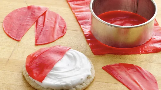 Step3To decorate cookies: Unroll fruit snack rolls. Cut 24 rounds, using 2 to 3-inch cutter; cut each round in half. Place 2 halves, points overlapping slightly, on top of each frosted cookie to look like wings. Using small amount of frosting, decorate each cookie with 1 creamy mint candy for head, small white hearts for eyes, licorice for antennae and large colored hearts for spots on wings. Store loosely covered.