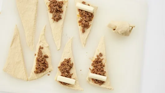 Step2Heat oven to 350° F. Separate each can of dough into 8 triangles. Top each with 2 heaping teaspoons turkey mixture, covering two-thirds of the dough. Leave space on all edges. Place half a cheese stick on widest end of each triangle. Fold outer corners in over cheese, then roll up, ending at tip.
