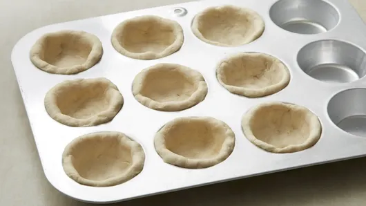 Step3Separate dough into 10 biscuits; press each biscuit to 3 1/2-inch round. Firmly press 1 biscuit in bottom and up side of each of 10 ungreased regular-size muffin cups, forming 1/4-inch rim.
