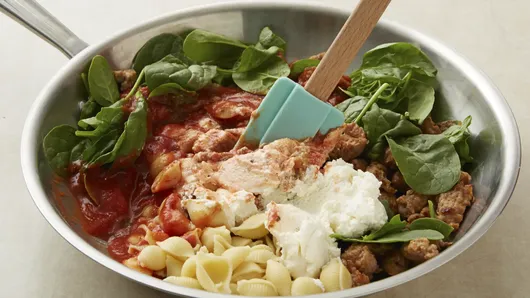 Step2Meanwhile, in 10-inch skillet, cook Italian sausage over medium-high heat, stirring frequently, until no longer pink; drain. Stir in pasta sauce, spinach, ricotta cheese and cooked pasta; cook 1 to 3 minutes, until hot and spinach wilts. Remove from heat.