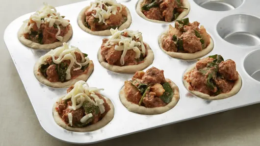 Step4Fill each cup with about 1/3 cup sausage mixture; sprinkle with mozzarella cheese.