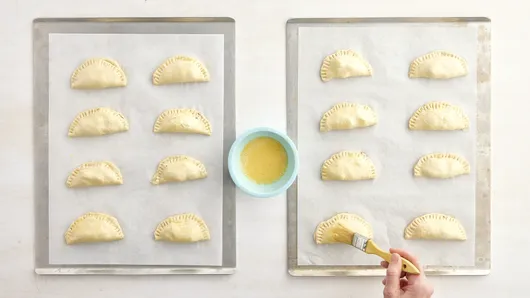 We love the golden brown, shiny crust you get on the biscuits when they are brushed with egg. You don’t have to do this step, however the foldovers will be lighter in color.