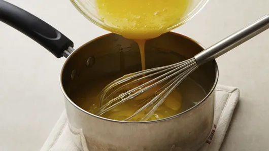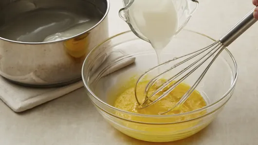 Step3Quickly stir about 1/2 cup hot mixture into beaten egg yolks; mix well.